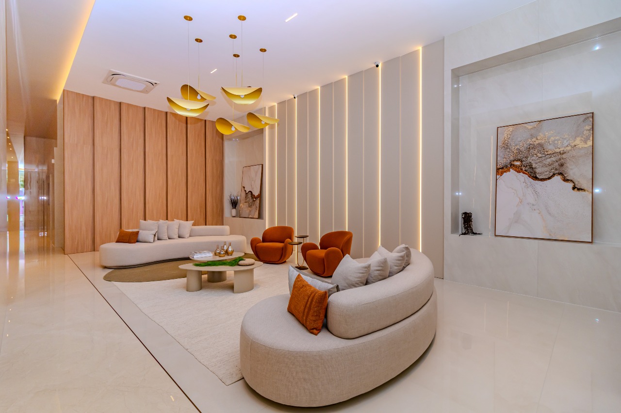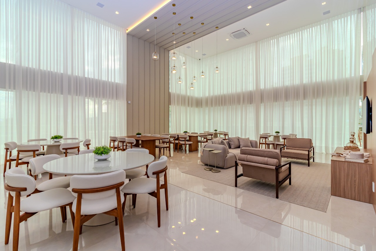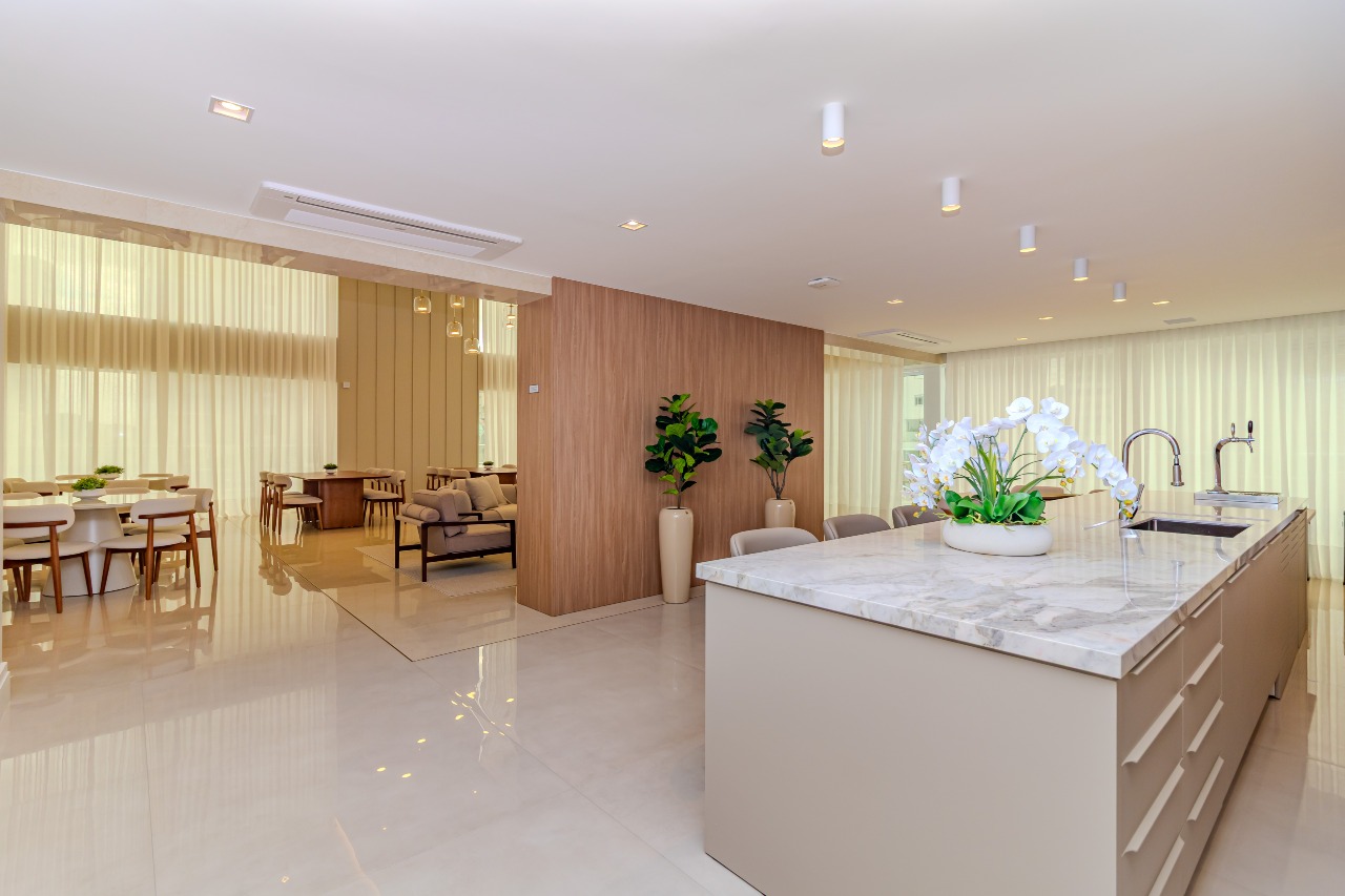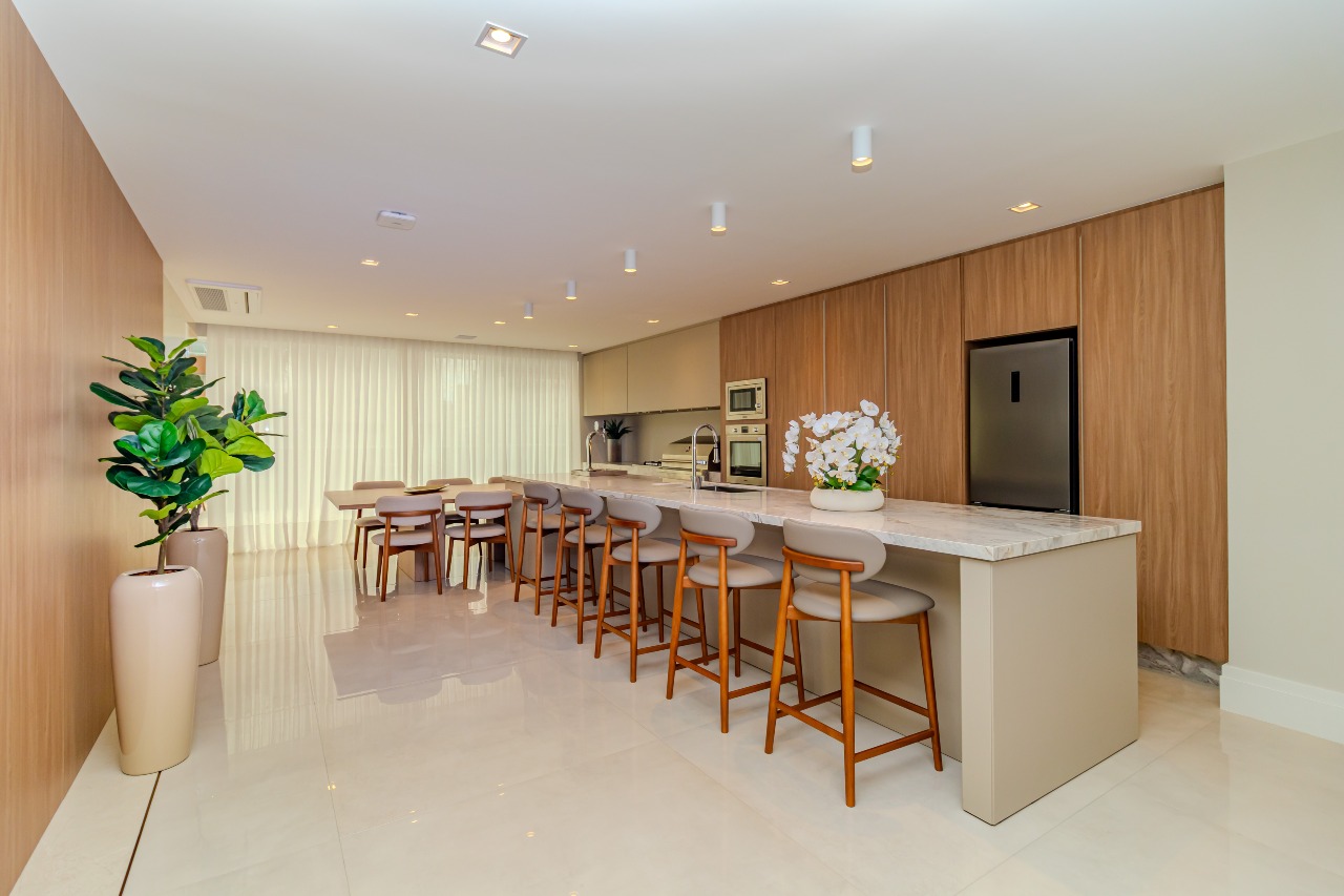Com um generoso espaço privativo de 140 metros quadrados, o imóvel foi desenvolvido para acomodar famílias maiores, oferecendo duas suítes master e duas demi-suítes, além de um lavabo para os convidados.