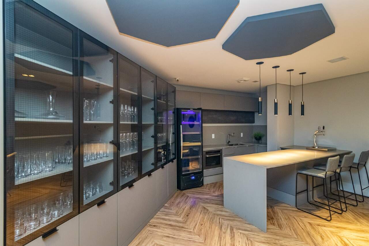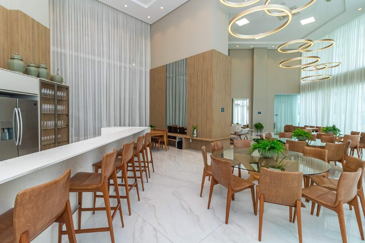 O living para três ambientes proporciona conforto e sofisticação, perfeito para receber amigos e familiares. A cozinha é funcional e integrada ao espaço social, e o lavabo traz praticidade ao dia a dia.