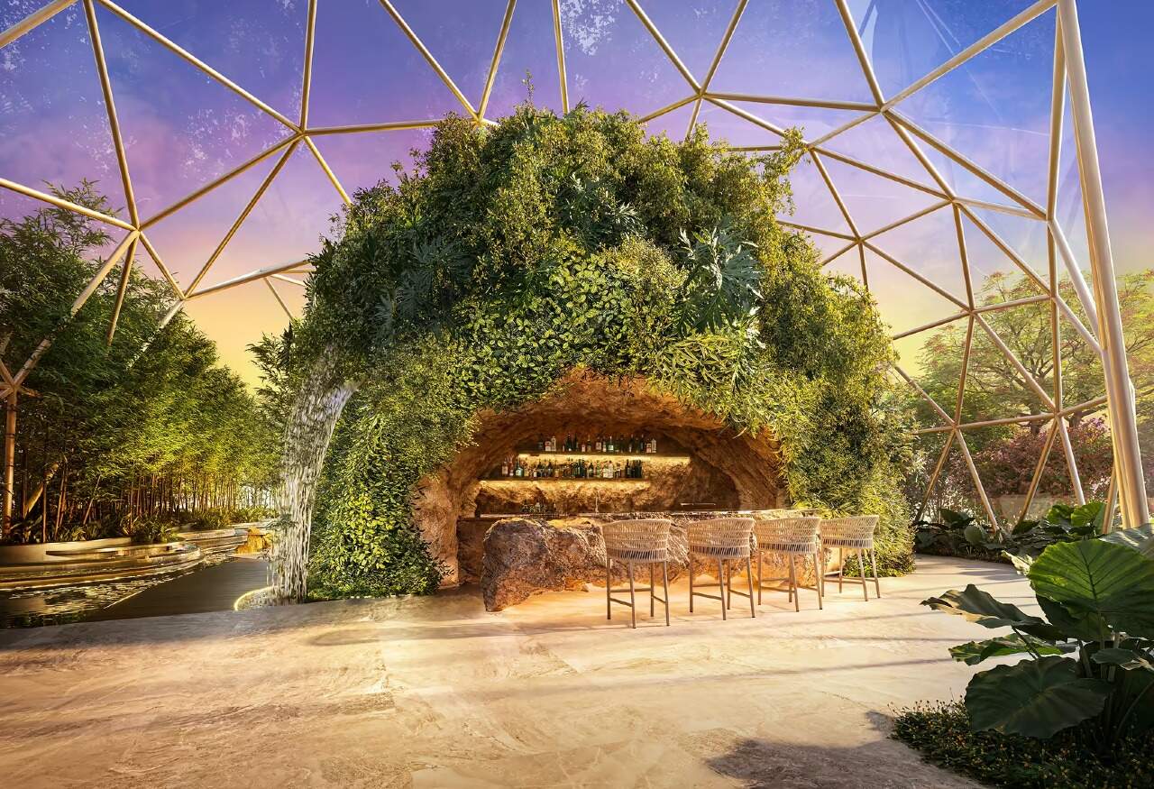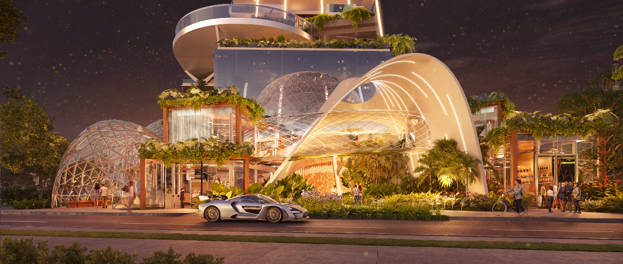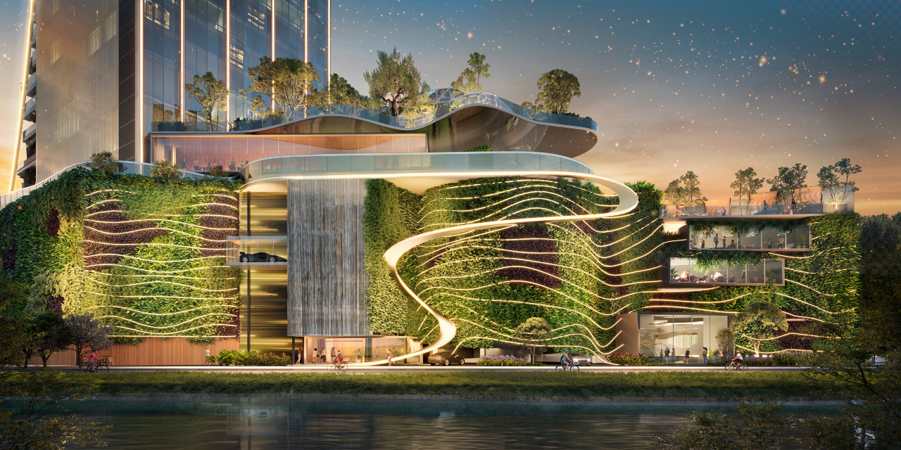 As mansões suspensas terão de 420 a 563 m² privativos, incluindo terraço com piscina em balanço, jardins e elevador para carros.